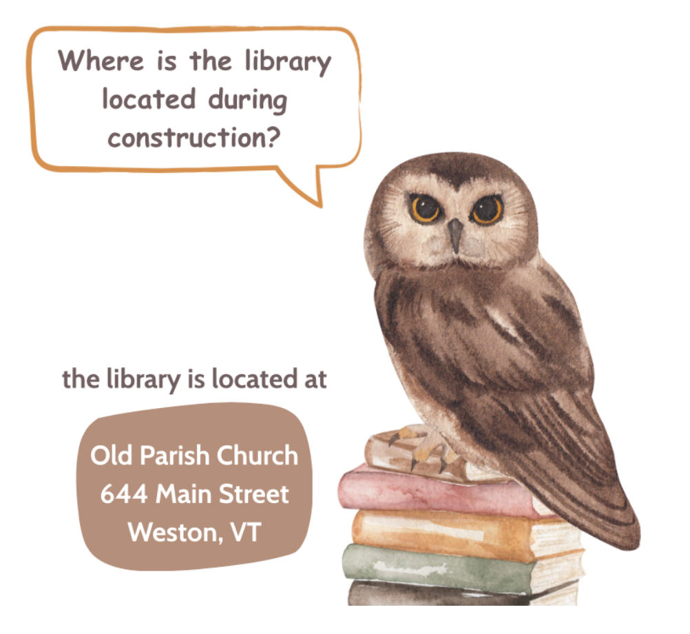 The library is located in the rear of Old Parish Church, 644 Main Street, Weston, VT.
