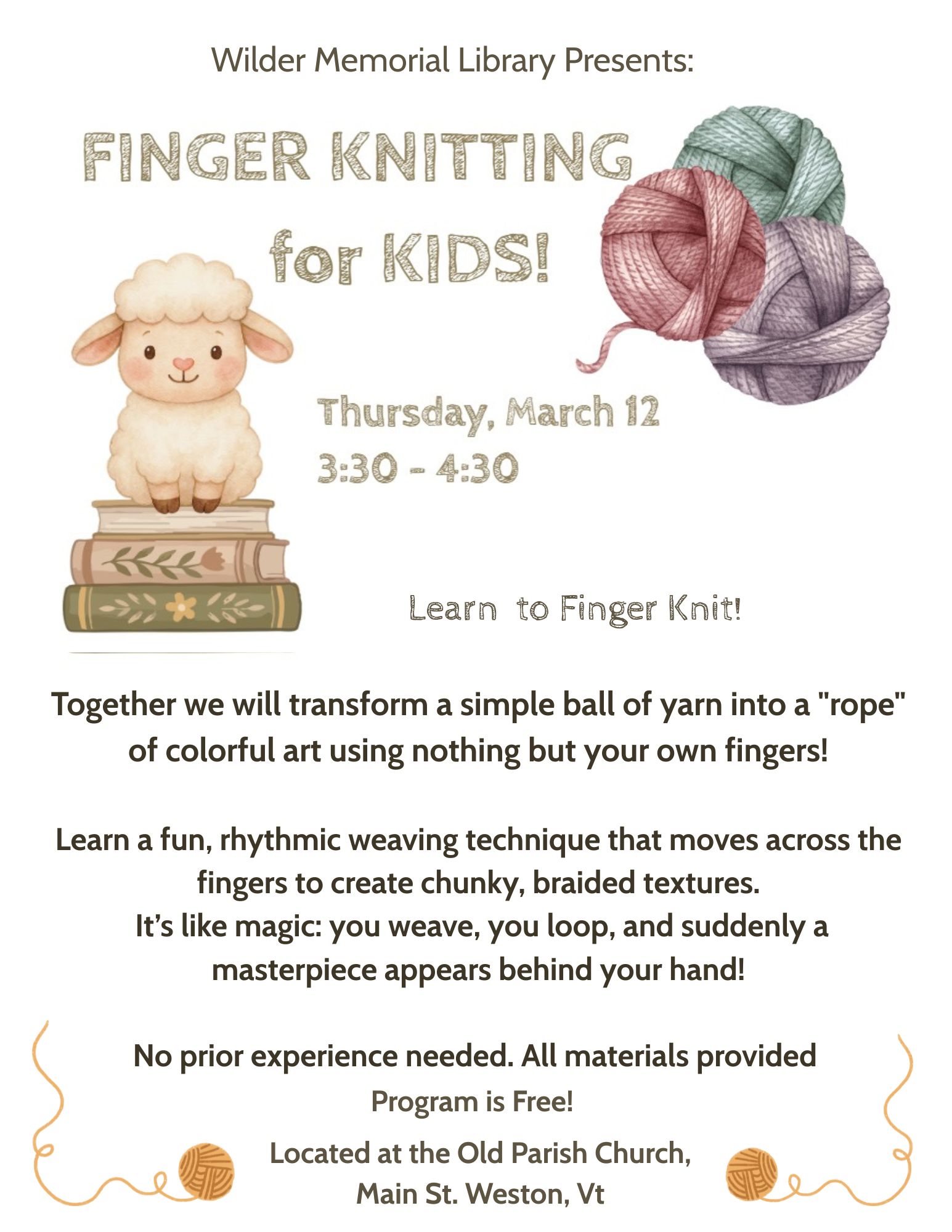 Location: Wilder Memorial Library at Old Parish ChurchLooking for a cozy space to knit and connect? Join our multi-generational Knitting Circle at the Library!