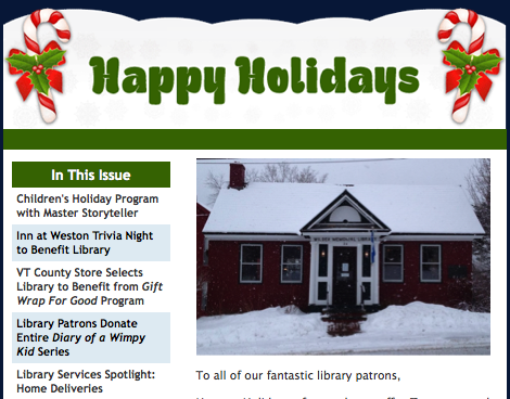 December 2014 eNewsletter Available! Posted bywildermemoriallibraryDecember 2, 2014Posted inUncategorized Click here to read the latest and greatest from the library!