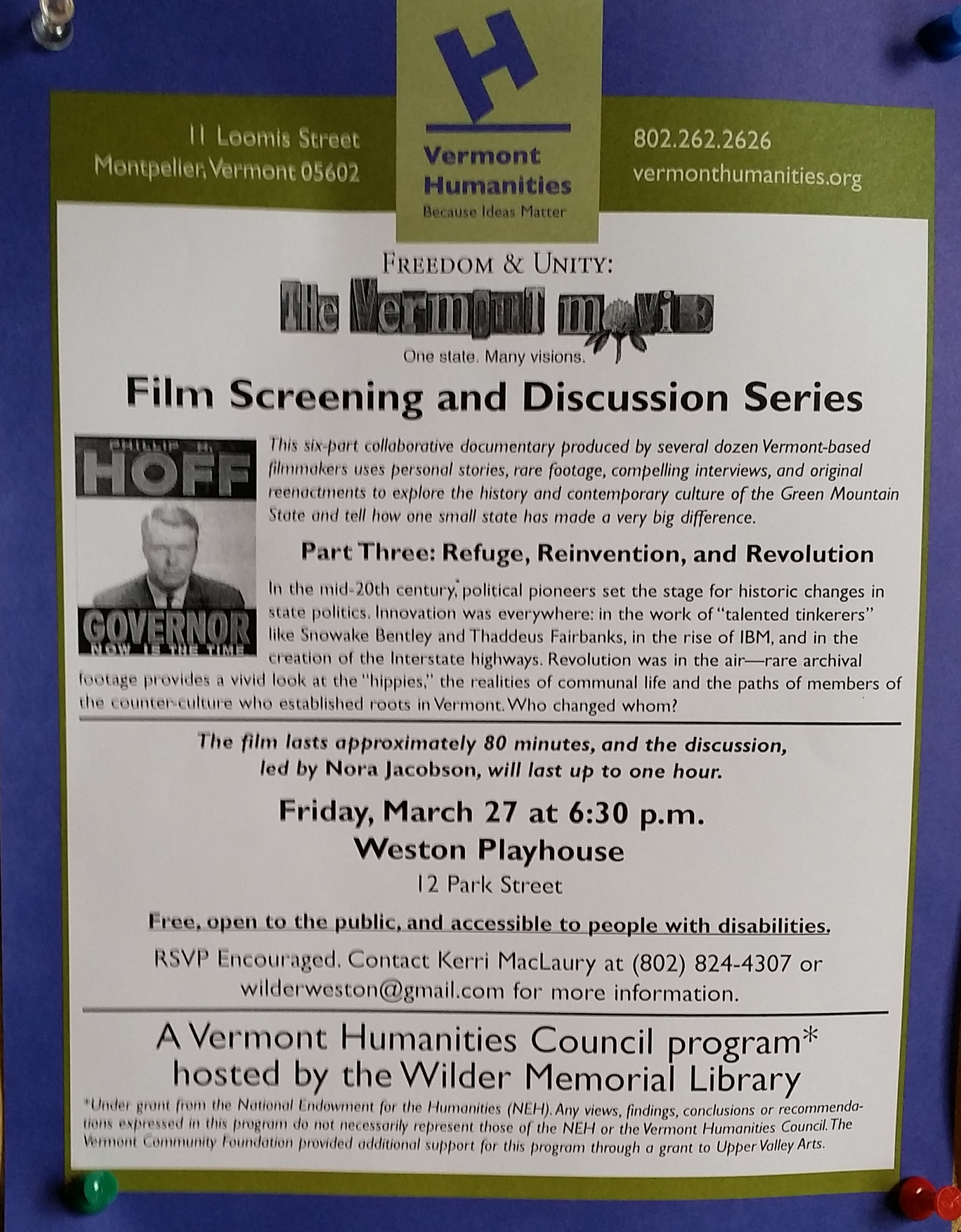 Screening & Discussion of The Vermont Movie-Part 3 Posted bywildermemoriallibraryMarch 5, 2015Posted inUncategorized