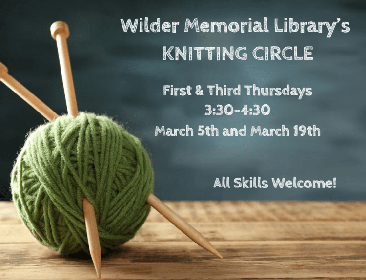 Location: Wilder Memorial Library at Old Parish ChurchLooking for a cozy space to knit and connect? Join our multi-generational Knitting Circle at the Library!